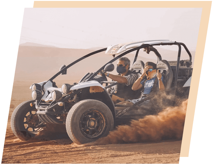 We will pick you up from anywhere in Dubai including your home, residence, hotel, or even directly from the airport. We provide two types of dedicated transport services including private and shared. The private transportation comes with premium packages while the shared transport is included in standard desert safari with a dune buggy package. Our professional drivers ensure your timely arrival at the desert camp. Here you will be welcomed by our hospitable team with drinks. The experienced and licensed guides brief you about the journey ahead. Listen carefully to the instructions and follow them on the desert trail. Wear the provided safety gear properly during your journey in the bouncy Dubai desert. Your real-time in the desert starts with a 30-minute dune bashing in a 4x4 Landcruiser where you enjoy the thrill of the ride and have scenic views of the desert. After that take a break, have snacks, and be ready for the next adventure–the dune buggy rides. This adventure takes place on self-driven buggies or guided buggy tours. Choose an option based on your comfort. Bash the dunes with an amazing dune buggy with full control of the vehicle on the bumpy desert terrain. Take your buggy up and down the sand mountains and feel the shifting desert sand.